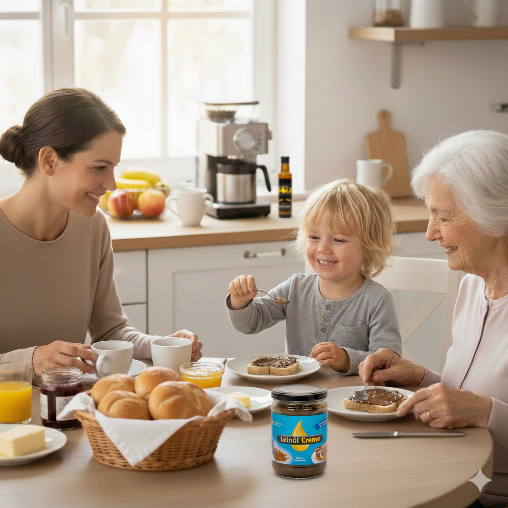 Aus leinölhaltigen Feststoffen, die aus dem frischen Speiseleinöl herausgefiltert werden und in ihrer Konsistenz zart cremig bis leicht feinkörnig, zu vielen Varianten einfach nur leckkkaaaaa schmeckt.