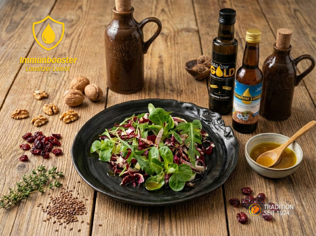 07 Jan. Wintersalat mit super leckerem Leinöl-Dressing . Zutaten: 150 g Salat, Rucola, Radicchio, Friseé, Zuckerhut, etc. 100 g Lausitzer Leinöl 50 g Apfel-Balsamico-Himbeer-E... Weiterlesen